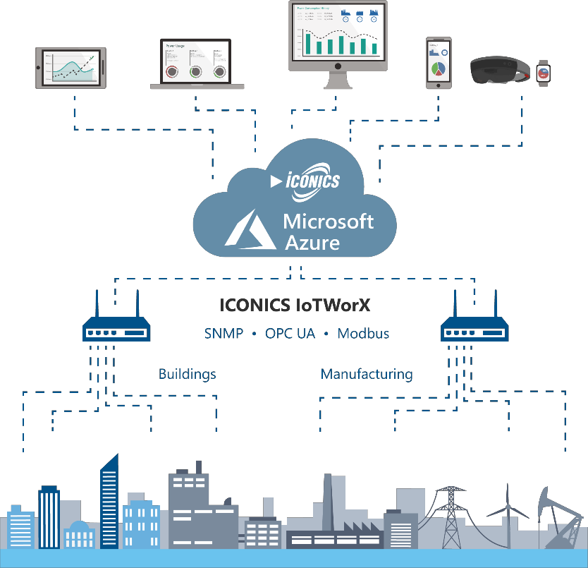 IoTWorX provides manufacturers and facility managers with a flexible platform to create Internet of Things applications. ICONICS offers several key IoT technologies, including rich connectivity to things (OPC, OPC UA, SNMP, Modbus), secure cloud communications, and built-in real-time visualization and analytics. With simple setup and configuration, users can easily create remote monitoring and analytics solutions that meet their innovative business requirements for collaboration and shared insight across widely dispersed assets. The ICONICS IoT solution leverages the Azure cloud to provide global visibility, scalability, and reliability. Connect to standard ICONICS applications in the cloud such as GENESIS64™, Hyper Historian™, AnalytiX®, and more. Optionally integrate Microsoft Azure services such as Power BI and Machine Learning to provide greater depth of analyses