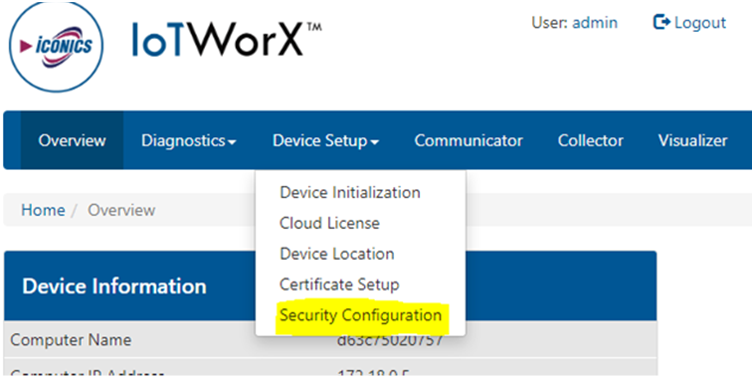 IMPORTANT: If you haven't already done so, log into the Diagnostics and Configuration page for your edge device and change the default admin password. Keeping the default admin password could provide a security vulnerability, allowing a malicious user to create an ICONICS security user. See the "Adding Security Users via Local Interface" section for more details.