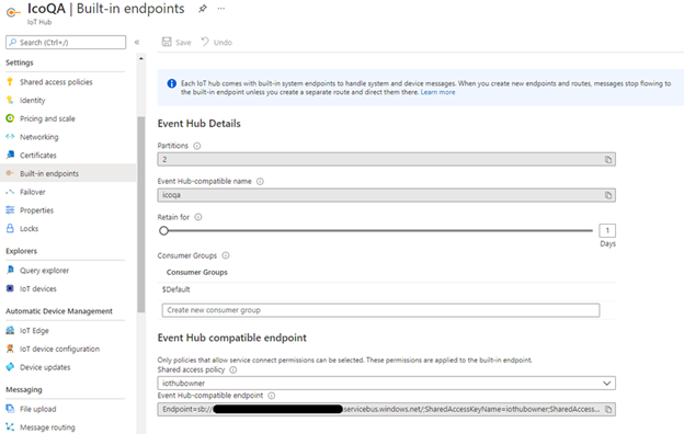 In the Azure portal, select your IoT Hub, select Built-in endpoints. Copy the Event Hub-compatible endpoint and keep it handy.
