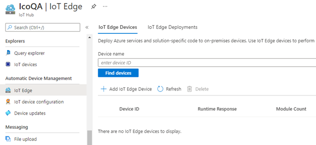 Now we are ready to create a device. Still on the IoT Hub page, select IoT Edge and then Add IoT Edge device.