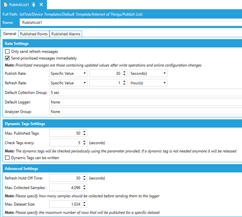 Next, we will define a publish list. Right click Publish Lists and select Add Publish List. Give your list a name and change the Default Collection Group to the group created in the previous step. Change the Publish Rate and Refresh Rate to values appropriate for your deployment.