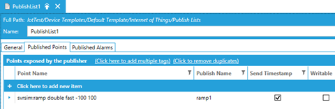 On the Published Points tab, add the points you would like to be published. As an example, you can enter svrsim:ramp double fast -100 100 as a point name with a Publish Name of ramp1. Apply your changes and close the form.