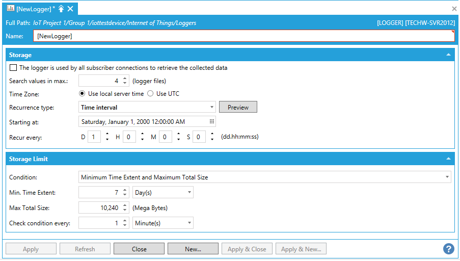 The logger is used by all subscriber connections to retrieve the collected data - Check this checkbox if you wish for this logger to retrieve collected data for all subscriber connections. If this box is checked, you will see a "Buffered Data" folder under each device in the Internet of Things node in the data browser, which will allow you to access the device's buffered data.