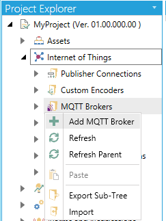 In the Workbench, expand a project and the expand the Internet of Things node. Right-click on the MQTT Brokers node, as shown below, and then click on Add MQTT Broker.