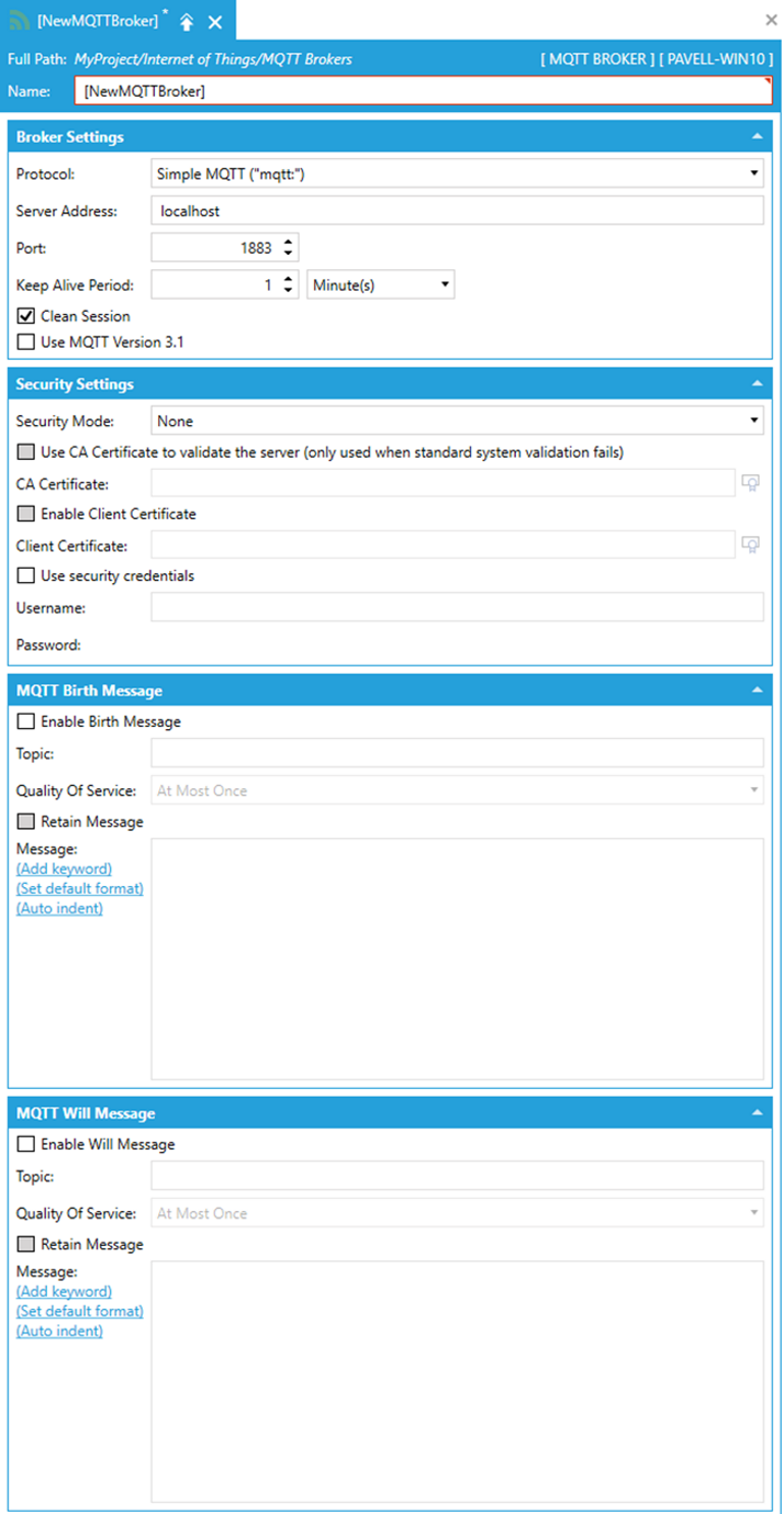 This opens the MQTT Broker properties window, as shown below, in the Workbench. Enter a Name for the MQTT Broker in the top text entry field.
