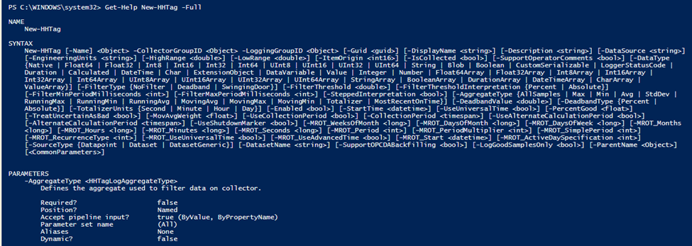 The New-HHTag command will create a new Hyper Historian tag, and this Get-Help command will list all of the possible parameters New-HHTag, along with a short description and which ones are mandatory.