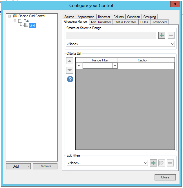 Grouping Range Tab in Grid Properties in Recipe Grid Control Configuration