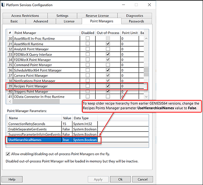 GENESIS64 client applications. Be aware that in newer versions of GENESIS64, the Data Browser is significantly different and recipes from previous versions are not compatible. To keep the older recipe hierarchy from an earlier version of GENESIS64, open the Platform Services Configuration to change the Recipes Point Manager point parameter UseHierarchicalNames value to False.