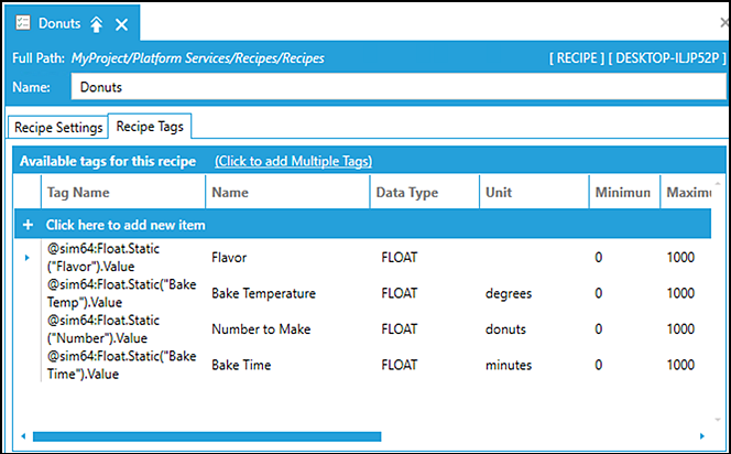 recipe items configured in Workbench are available as data points (tags) that can be used in several different