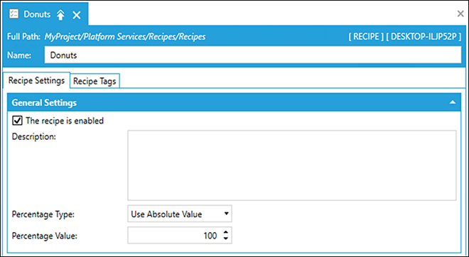 - In the Recipe Settings tab, select The recipe is enabled checkbox to activate the recipe server configuration. Enabled recipes are available to client applications.