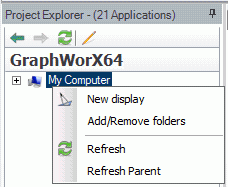 Select GraphWorX64 from the Project Explorer. (If GraphWorX64 does not appear, follow similar instructions as Starting SNMP Connector in GENESIS64, choosing GraphWorX64 as the provider). Right-click on your default machine (for example, My Computer) and click New display.