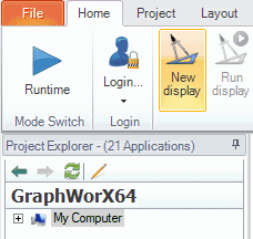 GraphWorX64 button in the Applications ribbon, then go to the Home ribbon and click the New Display button.