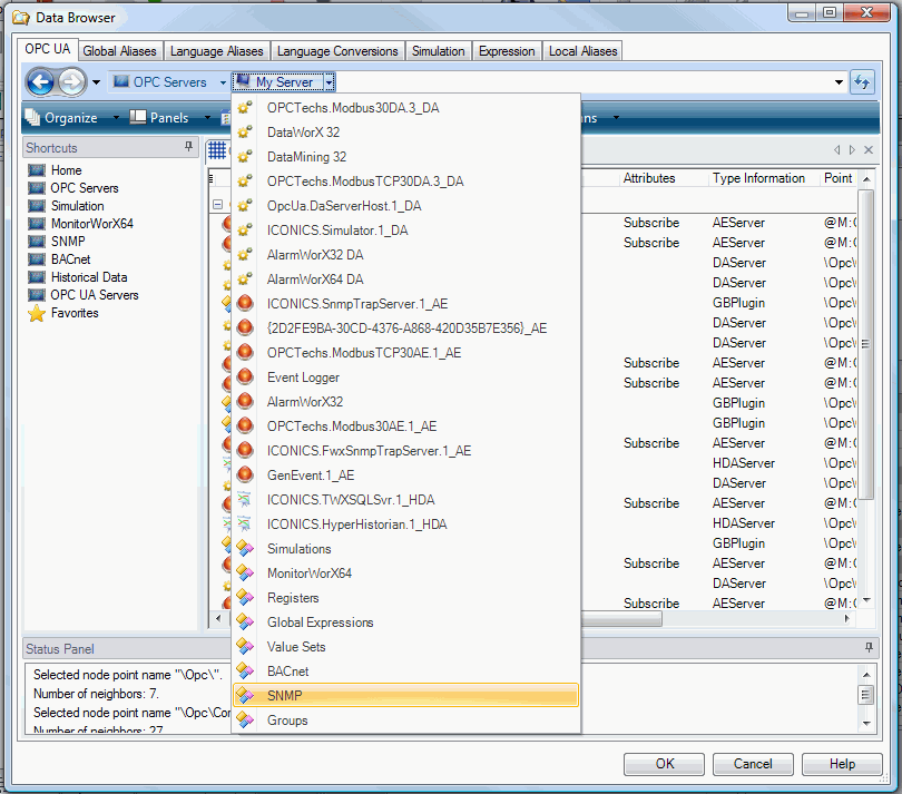 ) after each selected level for quicker selection. In this example, the OPC UA tab is selected; the user has navigated in the Grid view to OPC Servers, then My Server, then SNMP. (The Data Browser is described in detail in the Unified Data Browser topic.) Select the data source, and click OK.