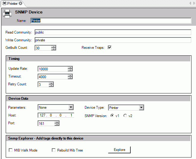 The MIB Walk Mode and Rebuild MIB Tree check boxes have the same functions of those seen during the Network discovery, but you can configure them differently for every device. You can connect directly to the selected device by clicking the Explore button. The tags selected will be added directly to the device.