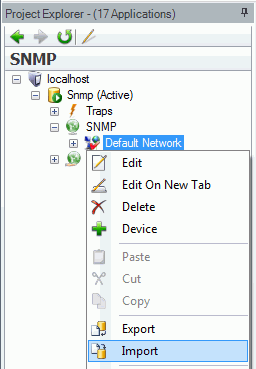 Right-click on an item in the SNMP Connector's Project Explorer. This can include a database, network, or folder level of the SNMP Connector Project Explorer. SelectImportfrom the menu.