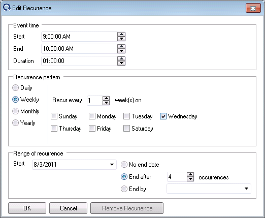 - To repeat this event, click Recurrence. The Edit Recurrence dialog box appears.