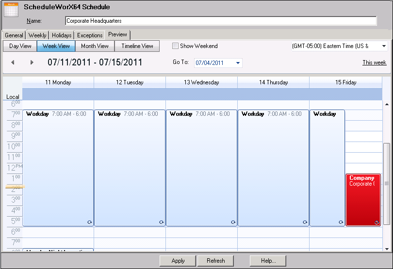 The Preview tab displays the Calendar for all possible time periods. You can't configure or create new events in this view, which makes it safe to display for any user viewing the calendar on their monitor. Scheduled events, exceptions, and holidays all appear on this view. The Preview view is shown below in the weekly view.