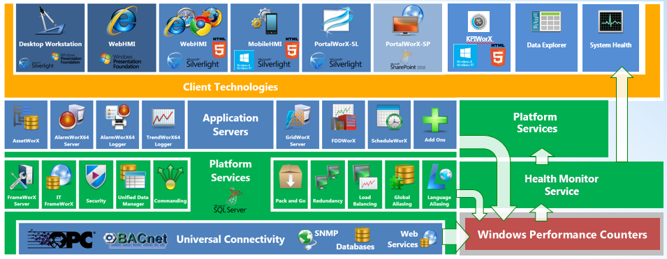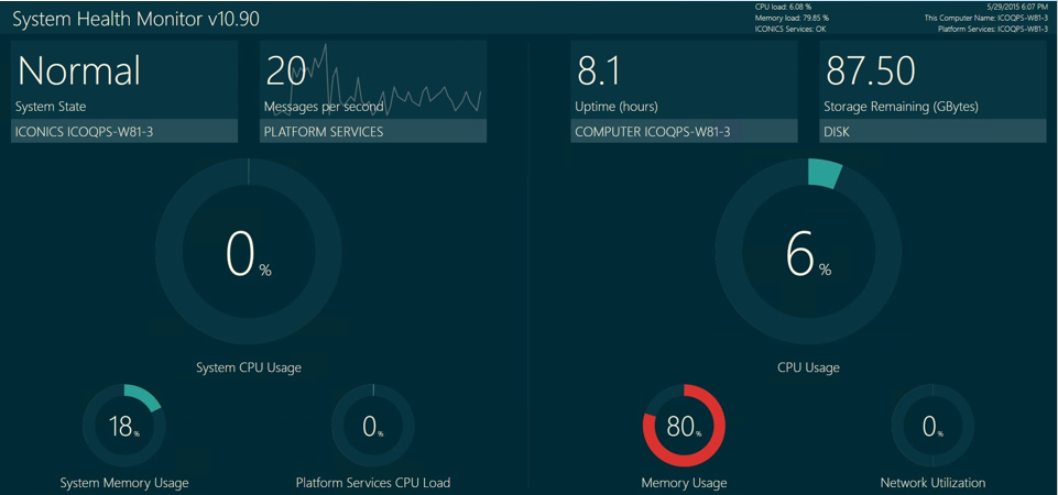 The System Health Monitor is a tool created to monitor the overall system, provide diagnostic tools and correct the situation. Multiple ICONICS services include performance-related information, via Performance Counter and Data Points (within Platform Services) and the System Health Monitor provides insight into this various information.