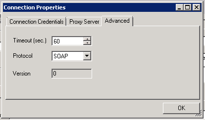 In the Advanced tab (shown below), you can set a timeout (in seconds) after which, the attempt to connect to the WSDL URL will cease. You can select the Protocol as to how to connect (SOAP, HTTP Get or HTTP Post). Depending on prior settings, or any future feature, you can also set a Version number. In this instance, the Version text entry is greyed out and not functional.