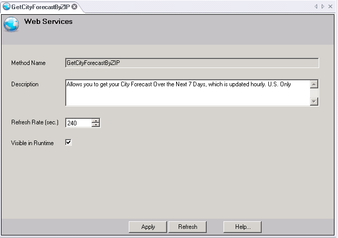 If you double-click on any of these sub-branches, you'll be able to make edits to additional settings. The Method Name might be pre-filled, but you will be allowed to edit the Description, as well as Refresh Rate (in seconds). You also have the option of selecting whether or not you would like this specific Web Service to be available to other ICONICS applications while in Runtime. Click the checkbox if you want to be able to select this particular Web Service, then click Applyto proceed. You'll also need to click on the [X] in the tab at the top of the Web Service settings window in order to close the window itself.