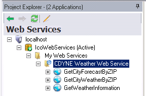 Once you click Apply within a newly added Web Service settings window, you may notice some additional sub-branches added beneath the newly added Web Service within the Project Explorer, as shown below. In the example below, you'll notice that "GetCityForecasByZIP", "GetCityWeatherByZIP" and "GetWeatherInformation" were added along with the "CDYNE Weather Web Service".