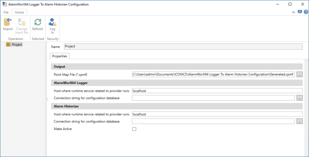 To convert the AlarmWorX64 Logger configuration and create a map file: