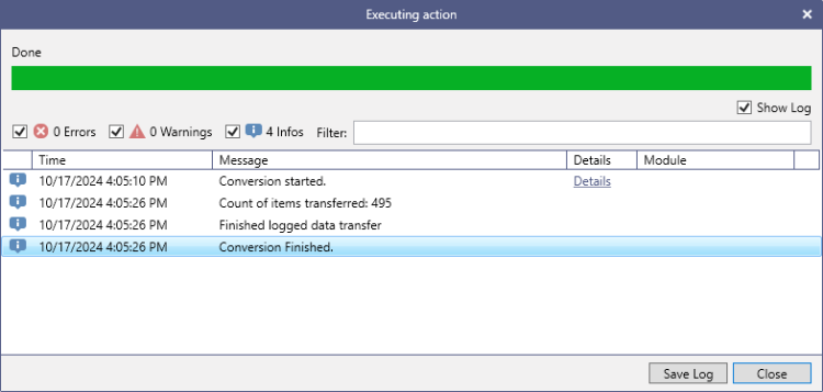 On the ribbon, select Transfer to start the conversion. In the process dialog, check the conversion status for potential errors or warnings.