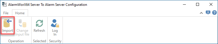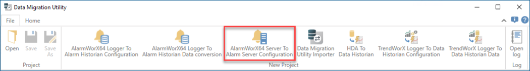 Select the AlarmWorX64 Server to Alarm Server Configuration plugin from the ribbon. The plugin dialog appears. There is a project panel on the left, settings panel on the right, and ribbon with available actions.