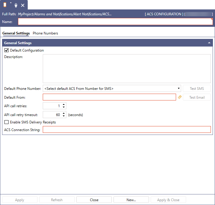 - Select the Default Configuration checkbox to make this configuration default. The Alert Notifications service requires a default ACS configuration to send Azure Communication alerts.