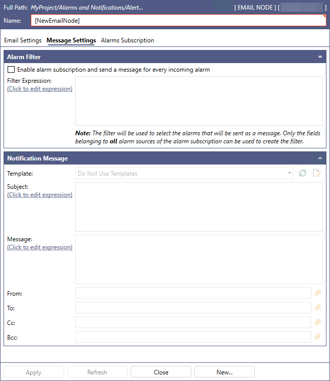 After configuring the Email Settings tab of an email node, you can configure the alarm filter and notification message preferences on the Message Settings tab.
