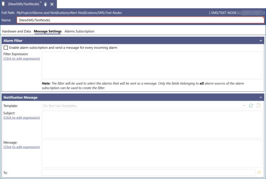 After configuring the Hardware and Data tab of an SMS/text node, you can configure the alarm filter and notification message preferences on the Message Settings tab.