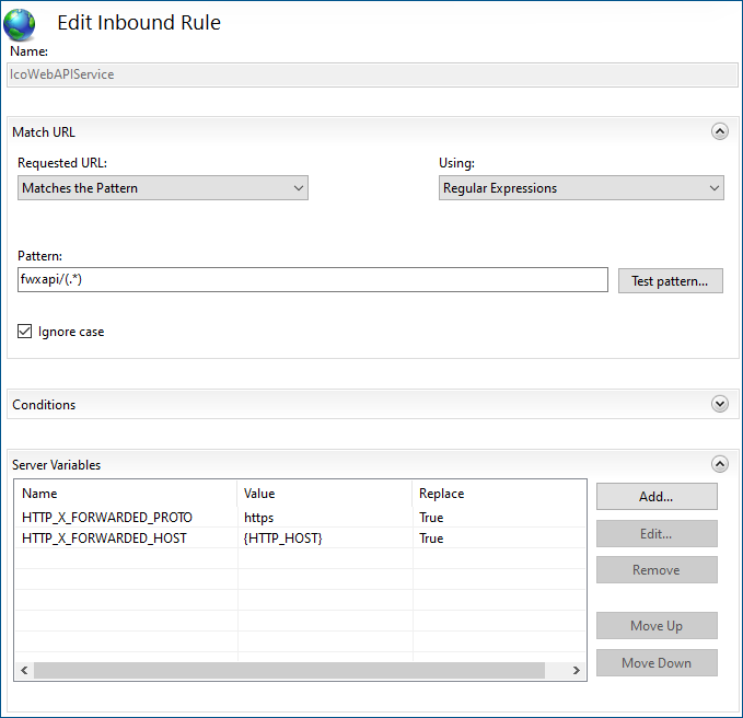 Make sure that the Server Variables section contains HTTP_X_FORWARDED_PROTO and HTTP_X_FORWARDED_HOST. If not, click Add on the right and add these two variables.