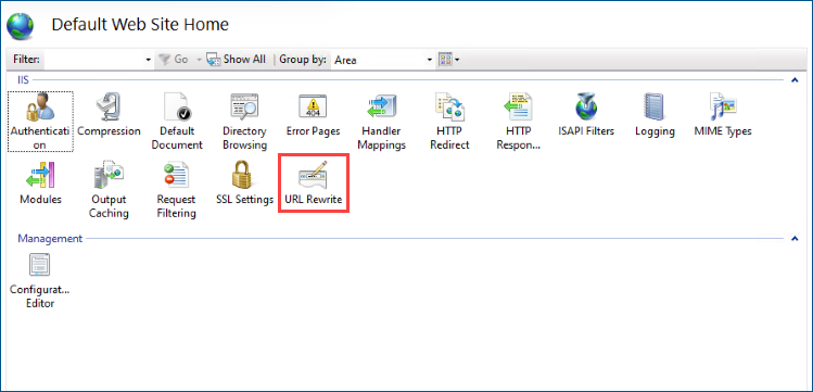 Open the IIS Manager and in the Connections menu, expand Web Sites > Default Web Site > IIS > URL Rewrite.