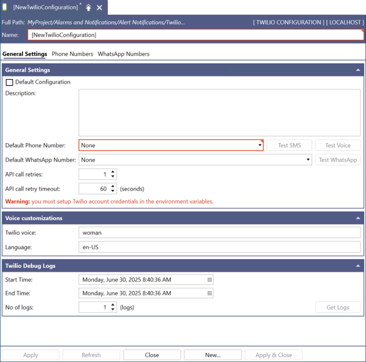 Right-click Twilio Configurations and select Add Twilio Configuration. The new Twilio configuration form is displayed.