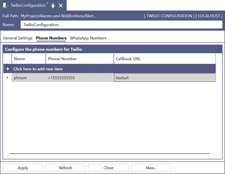 Additionally, select Enable Acknowledge ID if you have defined the default acknowledge code in the Connected Field Worker or Bridging configuration, or unique acknowledge IDs for individual workers in Connected Field Service. Learn more - In Project Explorer, navigate to Alert Notifications > Twilio Configurations, open the default Twilio configuration, and go to the Phone Numbers tab.