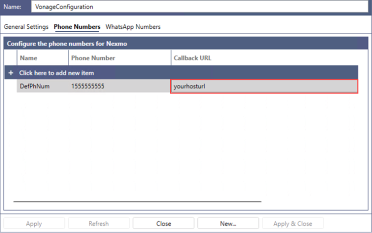 In the Callback URL field of the default phone number, enter the host URL that was set up using GENESIS Web API Service and is accessible externally via HTTPS. Then click Apply.