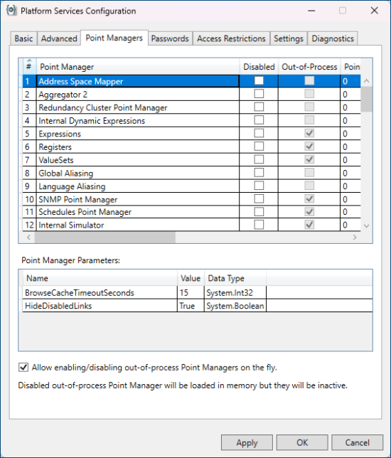 - Select the desired point manager from the table in the top of the dialog. Any parameters associated to that point manager will be displayed in the bottom section.