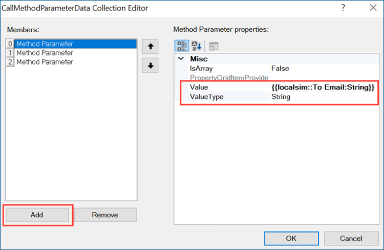 - Click Add under the Members section to display the method parameter properties in the right panel.