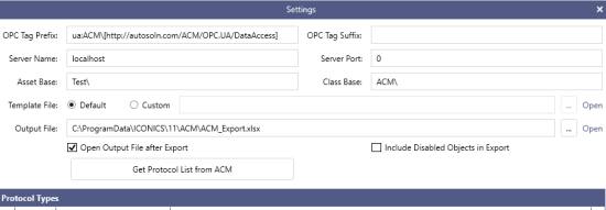 Performing changes in fields is possible to edit defaults settings like OPC Tag Prefix, OPC Tag Suffix, Server Name, Server Port, Asset Base, Class Base and Output File.