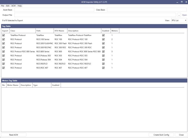 After reading ACM database, the table will be filled with all devices found. When you select a device, the meters will be shown in the second table.
