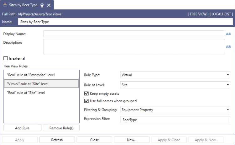 You can check the configured equipment levels under Assets > Product configuration > Equipment hierarchy. For example, the sample database's hierarchy levels are: Enterprise > Site > Area > Process Cell > Unit > Equipment Module > Control Module. If you define a Real rule for the Unit level, subsequent rules in the tree view can only be defined for the Equipment Module or Control Module levels. - For the Virtual rule type, select the filtering criteria in Filtering & Grouping. Virtual rules can filter assets by an equipment property, object property such as name or description, or a custom expression.