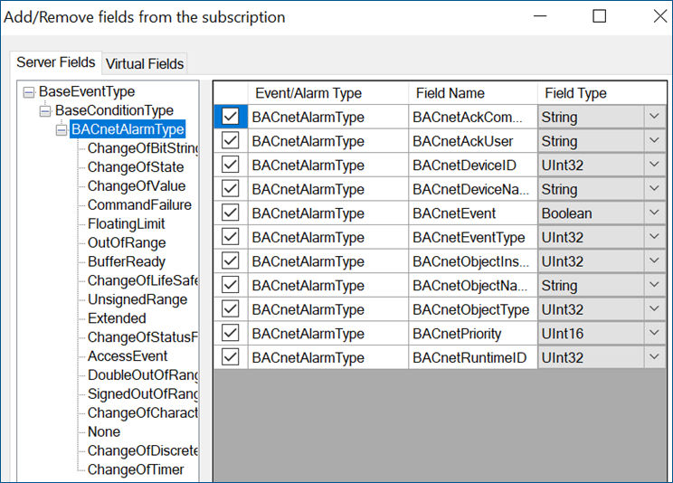 2. In the left panel of the new dialog, select BACnetBaseAlarmType.