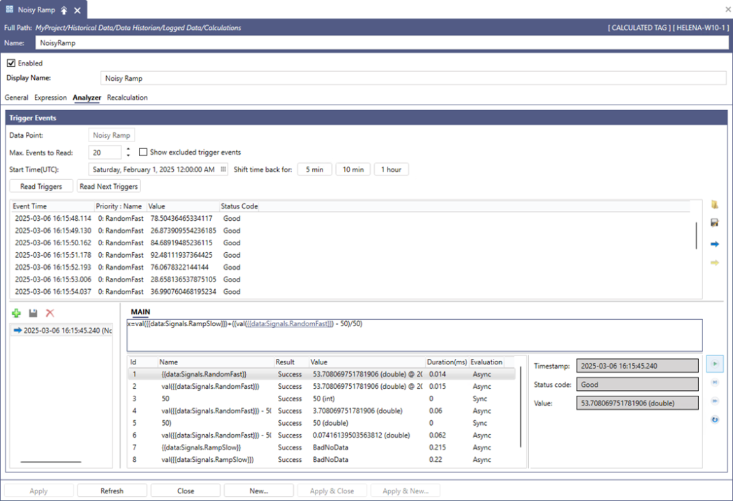 Some performance calculation formulas can become complex, making validation challenging. The calculation analyzer tool facilitates this process by providing detailed calculation analysis. You can access it on the Analyzer tab of the calculated tag configuration dialog. To begin, read trigger events from the running Data Historian, select an event to analyze, and execute it in the lower section of the analyzer interface. The tool displays step-by-step data processing with all intermediate calculation results, allowing users to trace how the final value was derived.