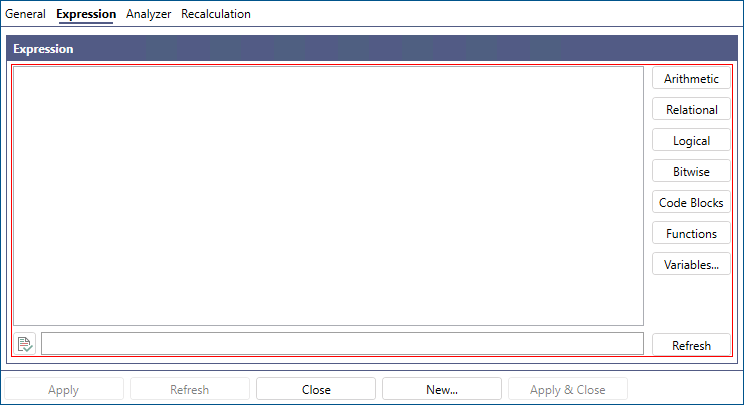 8. When finished, switch to the Expression tab and enter the formula for processing the data. Use the buttons on the right to add built-in operators and functions to the expression.