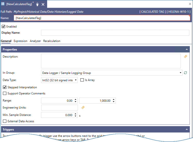 2. Right-click Logged Data and select Add Calculated Tag to open the tag configuration settings.