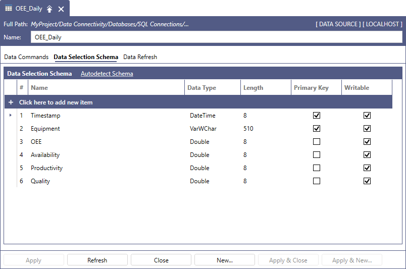 After you have configured the data source's SELECT Command, select the Data Selection Schema tab. The current schema of the data source is displayed, along with the column properties.