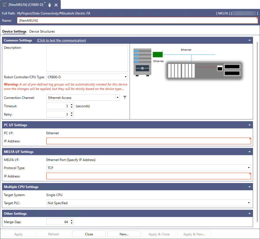 - In the Other Settings section in Merge Gap, enter the value that indicates the number of non-contiuguous registers that can be batch-read in a single communication between Mitsubishi Electric FA and MELFA devices. This value should be set larger than the number of I/O address points between the tags. If the value is too small, multiple communications will be required to read the data. This setting is for adjustment purposes, and is usually recommended to leave it at the default value of 64. Please refer to Merge Gap Details for more information.