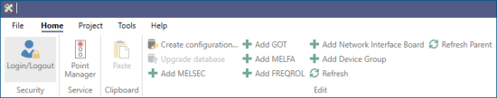 Select the Mitsubishi Electric FA node in Project Explorer, and then click the Add Network Interface Board button in the Edit section of the Home ribbon.