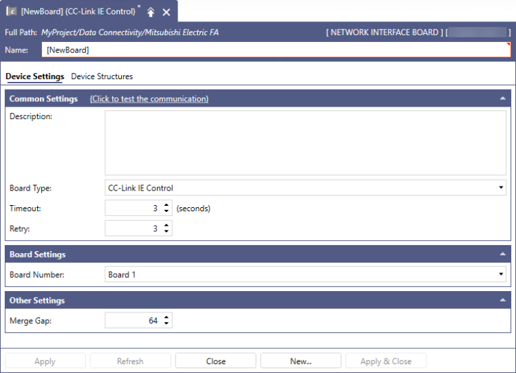 - In the Other Settings section in Merge Gap, enter the value that indicates the number of non-contiguous registers that can be batch read in a single communication between Mitsubishi Electric FA Point Manager and network interface board devices. This value should be set larger than the number of I/O address points between the tags. If the value is too small, multiple communications will be required to read the data. This setting is usually left at the default value of 64. Please refer to Merge Gap Details for more information.
