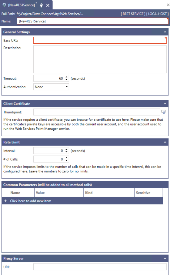 Allows you to configure parameters that are common to all calls made to the REST API, so that they can be defined only once and applied to all web methods configured under the service. This is useful, for example, if there is a value (like an API key) that must be sent will all calls, as you can define it only once for all methods.